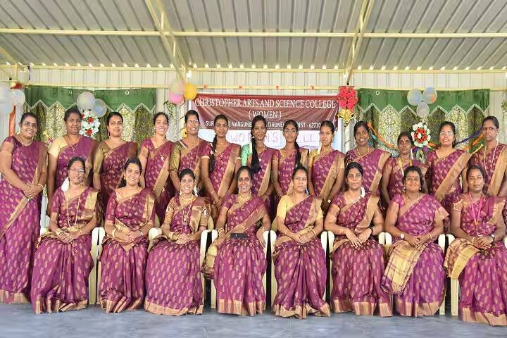 fee and submitting original documents within a given timeframe.Normally, the admitted students are required to attend an orientation programme before the beginning of classes.Christopher Arts and Science College Degree-Wise Admission ProcedureAdmission procedure for Christopher Arts and Science College for Women, Surangudi, involves the following steps:Christopher Arts and Science College for Women B.Sc Admission ProcessThe college offers B.Sc. programmes in Mathematics, Physics, Computer Science and Chemistry. Admission to these programmes is done on performance in the 10+2 examination. Depending upon the requirement, the eligible candidates may also be called for an interview during the selection process.Christopher Arts and Science College for Women B.Com Admission ProcessB.Com programme is also available for admission to all the candidates who have completed the 10+2 level in any stream, though preference will be given to Commerce background students. Admission is based on the marks obtained in the qualifying examination, and also on the performance during an interview that is conducted.Christopher Arts and Science College for Women BA Admission ProcessThe college offers BA programmes in English and History. Christopher Arts and Science College for Women's admission to these BA programmes is based on the merit of their 10+2 score.Christopher Arts and Science College for Women, Documents Required10th and 12th standard mark sheetTransfer certificateCommunity certificate for SC/ ST/ OBC candidatesAmong others as directed by the concerned college.Christopher Arts and Science College for Women admission process is based on merit.Read more View All Admission Process Get Admission DetailsChristopher Arts and Science College Women, Surangudi FacilitiesSportsAuditoriumLibraryLaboratoriesI.T InfrastructureCafeteriaMedical/HospitalTransport FacilityAlumni AssociationsView All Facilities Student Reviews for Christopher Arts and Science College Women, Surangudi3.6/5(1 Reviews)College Infrastructure: 3/5Academics: 4/5Placements: 2/5Value for Money: 5/5Campus Life: 4/5Ecstatic experience.Posted on 14 Feb'24 by R.SakeelaBatch of 2022-01-01 | BA EnglishCollege InfrastructureYes,Our college have all the necessary infrastructure, facilities and equipments.It has huge ground ,smart boards and well maintained by non-teaching staff.It has well equipped classroom .Its so hygiene and clean.Read More View All Reviews Share your experience with othersWrite a reviewHave a questi